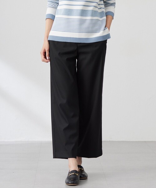 フロントポケット口のパイピングテープがワンポイント! ストレスフリーな穿き心地のワイドパンツ ■デザイン ストレートラインでややワイドシルエットのパンツ。フロントにタブ&釦ディテール、後ろウエストベルトはゴム入りで穿き易い作りになっています。トップスをインでもアウトでもポイントとなるフロントポケット口のパイピングテープもワンポイント。シンプルなスタイリングから女性らしい着こなしまで幅広く活躍してくれる、1着は持っておきたいアイテムです。裏なしです。 ■素材 ポリエステル、レーヨン素材特有のもたつき感が少ない、すっきりとした軽やかさのある肉感と風合いに仕上げた素材を使用。平織りの為そこまで重くなることもなく透けることもないという絶妙なバランスをとった素材で、伸縮性がありストレスフリーに着用して頂けます。手洗いも可能なイージーケア素材です。 ■同素材アイテム ・Aラインスカート(SKGJGS6255) 大きいサイズ(SKGTGS6255) 小さいサイズ(SKG0GS6255) ・テーパードパンツ(PRGJGS6255) 大きいサイズ(PRGTGS6255) 小さいサイズ(PRG0GS6255) ※商品画像はサンプルを使用しているため、色味やサイズ等の仕様に変更がある場合がございますので、予めご了承ください。 洗濯表示 【本体のみ】40℃まで手洗い可 塩素系漂白不可 タンブル乾燥不可 日陰つり干し乾燥 アイロンは160℃まで 弱いドライクリーニング(石油系)可 弱いウェットクリーニング可
