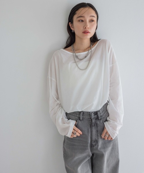 ーーー華奢見えするゆったりとしたサイズ感がポイント★着方を変えて楽しめるシアーロンTーーー■Design首元は広めに設計することで、ボートネックとワンショルダーの両方の着こなしを楽しめるシアートップス。ラフに着こなせるゆったりとしたサイズ感で、女性らしい華奢さを演出します。1枚での着用はもちろん、シンプルなスタイルにプラスすることで今年らしいレイヤードが楽しめるところが◎■Material程良く薄く、シアー感がある生地で、暖かい季節まで活躍します。伸縮性があるので、ストレスなく着用できるところが嬉しいポイント♪■Stylingシンプルなデザインなので、幅広いボトムと合わせて楽しめます。カーディガンやスウェット、キャミワンピのインナーとしての着用も◎シアー素材を活かして、インナーに柄やカラーを合わせたスタイリングもオススメです。-INFORMATION-◆商品のお気に入り登録完売していても再入荷時に再入荷通知を受け取ることができますので、是非ご登録ください♪◆ブランドのお気に入り登録新商品や再入荷などの情報を受け取ることができますので、是非ご登録ください♪※屋外の光や照明の当たり具合で、実際の商品の色味とカラー別画像の色味に違いが発生する場合がございます。 商品の色味はスタジオ撮影の詳細画像にてご確認ください。