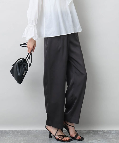 こなれた印象で履きこなせる大人きれいめサテンパンツ ■デザイン サテン地の素材がきれいめにも着こなしやすいゆとりのあるテーパードシルエットのパンツ。やわらかな素材は程よい肉感で身体のラインを拾わないのも嬉しいポイント。ウエストはゴム仕様のイージーな履き心地です。 ■素材 適度な肉感で履き心地の良い光沢感のあるサテン素材を使用。さらっとした上品見えな素材はきれいめな印象に。 ■コーディネート サテン素材はニットやカットソーなど表面感のあるトップスと相性抜群。きれいめからカジュアルまで幅広く着回せます。デイリースタイルにもぴったりなパンツはいつものコーデも今年らしくこなれた印象にアップデートしてくれます。 -------------------- 着用シーズン 春:◎ 夏:◎ 秋:○ 冬:△ -------------------- 洗濯表示:洗濯機洗い可 透け感:なし 裏地:なし 伸縮性:なし ウエスト:ゴム仕様 生地の厚さ:やや薄手~ふつう -------------------- ■スタッフ着用コメント <スタッフ身長:157cm/着用サイズM(38)/普段の着用サイズS(36)~M(38)> ゆったりらくちん、ストレスフリーの履き心地がうれしいきれいめサテンパンツです。素材は落ち感のあるなめらかなポリエステル素材で、ハリがあるというよりも柔らかな質感。裏地なしで軽い履き心地ですが、薄手すぎないほどよい肉感なので透け感は気になりませんでした。ウエストは総ゴム仕様のプルオンデザインで、内側の紐で調節可能。38サイズでややゆとりのあるサイズ感でした。しわになりにくく洗濯機洗い可能なので、ご旅行の持ち運びにもおすすめです。 <スタッフ身長:160cm/着用サイズM(38)/普段の着用サイズS(36)~M(38)> ワイドほど太くなく、程よくゆったりとしたテーパードシルエットのパンツです。光沢感があるのできれいめカジュアルコーデが叶います。ウエストの内側に紐が付いてるので、多少サイズ調節可能です。 <スタッフ身長:163cm/着用サイズM(38)/普段の着用サイズM(38)> とろみのある素材感で落ち感があるので、下半身細見え効果のあるリラックスパンツです◎ファスナーはなくスポッと履けるプルオン仕様で着脱も楽ちんにできちゃいます。肉感を拾いにくいシルエットなので、下半身にボリュームのある私でもスッキリ着ることができました! -------------------- ※自然光・照明の関係、パソコン・スマートフォンなどの環境により、実際と色味が違って見える場合がございます。予めご了承ください。商品の色味は、詳細画像をご参照ください。 ※サンプルでの撮影となるため、実際にお届けする商品と仕様やサイズが異なる場合がございます。