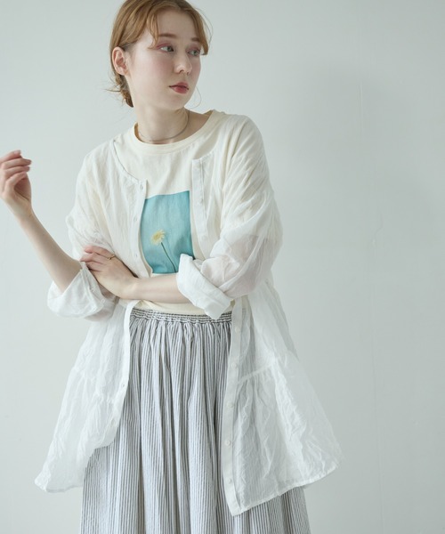【さりげないシアー感が大人ヘルシーに ふわりと広がるエアリーなティアードブラウス】 ・前後2wayで着回せる万能な1枚 ・たっぷりギャザーのティアードシルエット ・ノーカラーのすっきりした首元 ・ギャザーの入らない袖口、幅広のカフスで甘くなりすぎないデザインに ・シアーな素材感とネップ糸のナチュラルな風合い、しわ加工が入った特徴的な生地を使用 ~スタイリング~ ボタンを前でも後ろにしても、開けて羽織りとして着こなすのも◎ 軽く透け感のある素材でインナー次第で春から夏の冷房対策の羽織りとしても活躍します。 合わせるアイテムを選ばずに着回せる万能な1枚です。 - - - - - - - - - - - - - - - - - - - - - - - - - - - - - - - - - 透け感:あり 裏地:なし 伸縮性:なし 光沢感:なし ポケット:なし あり 洗濯: 自宅洗濯可能(ネット使用推奨) - - - - - - - - - - - - - - - - - - - - - - - - - - - - - - - - - ※着用、お取り扱いの際は、商品についている品質表示とアテンションタグを必ずご確認下さい。※サンプル商品で撮影をしております。生産時の生地のロット違いによる色の差が生じる場合もございます。 お使いのデバイスにより商品写真のお色が実物と異なって見える場合がございます。不良品ではございませんのでご了承くださいませ。 春物/シアートップス/シアーシャツ/春カラー