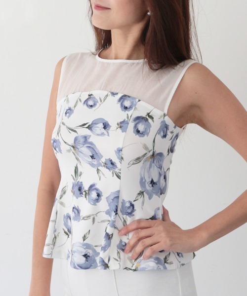 ストレッチ性の高いスムースジャージー素材を使用した華やかなフレアトップス。 白地にオリエンタルブルーと、薄いベージュベースにメープルレッドの色を乗せた水彩タッチの花柄は 洗練されていながら、どちらも落ち着いたトーンの色味。 デコルテ、バックにシアー生地をドッキングし涼しげで女性らしい印象に仕上げました。 多色使いをしていないのでワードローブに馴染み、スタイリングしやすくなっております。 ウエストを細く見せ、裾にかけてほんのり広がるシルエット。 腰上にかかる着丈なのでバランスがとりやすく、綺麗めパンツやタイトスカートで上品にも、 デニムでカジュアルにも合わせることができます。 共生地で【CFVA0452 フラワープリントハイウエストペンシルスカート】も展開しており、 セットアップ着用が可能です。 ※発送上の状態によって商品がシワになる場合がございます。 ※商品により色落ち・色移りがある場合がございますので、品質表示をご確認の上、お取り扱いにご注意くださいませ。 ============================== 今季より事業変更のため、ショップ名が「DURAS ambient」から「AMBIENT」へ変更となります。 それに伴い、商品タグが「DURAS ambient」と「AMBIENT」で混在している可能性がございますので、 予めご理解とご了承の程よろしくお願い致します。 なお、ショップ名は変更となりますがブランドコンセプトはこれまでと変わらず、更なる発展に努めて参りますので、 今後とも変わらぬご愛顧のほどよろしくお願い申し上げます。 ==============================