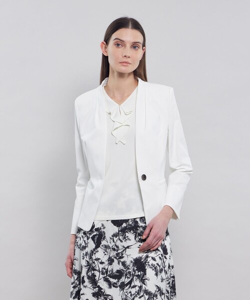 【素材】 肌離れのよいポリエステル機能糸を使用した、綿麻混のオックスフォードストレッチ素材です。ヨコ糸に綿麻の糸を使用したことで、ナチュラルかつ清涼感のある表情に仕上がっています。ウォッシャブル、吸水速乾、接触冷感、UV対策、透け防止と、多数の機能性を備えた優秀素材です。 【デザイン】 コンパクトなVネックノーカラージャケットです。肩のタックディテールが上品なニュアンスを与えます。ウエストはパネル切り替えにより程よくシェイプされたシルエットで着用時の美しさにこだわりました。シンプルなデザインなので、オフィスからオケージョンシーンまで幅広く取り入れやすい一着です。セットアップで着用いただける同素材のワンピース(品番:M5J19536)やスカート(品番:M5S25536)、パンツ(品番:M5R16536)も展開がございます。 ご自宅で手洗い可能です。洗濯表示に従ってお手入れしてください。 透け感:なし 伸縮性:あり 生地の厚さ:普通 おすすめ着用期間:春、夏、秋 ※この商品はサンプルでの撮影を行っています。 実際の商品とイメージ、仕様が異なる場合がございます。
