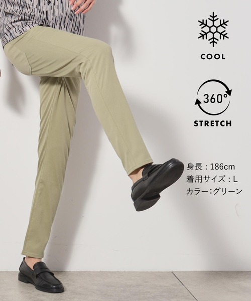 大人気の360°プレミアムスキニーパンツを接触冷感機能をプラスし、夏バージョンに改良した新モデルが登場!!■ポイント/詳細ブランド定番の「360°プレミアムスキニーパンツ」をベースに、夏仕様にアップデートした一本。スキニーパンツながらもヒップや太ももにわずかなゆとりを持たせることで、ピタッとしすぎず快適な穿き心地を実現。ベーシックカラーに加えて、清涼感のあるオフホワイトやオリーブグリーンなど、ライトカラーも展開し、夏の着回しにもぴったりなアイテムに仕上がっています。シンプルでトップスを選ばず、オンオフ問わず活躍する不動の人気アイテム。■素材/機能特性素材には吸湿冷感機能を備えた特殊加工を施しており、汗を吸収することで冷たく感じる性質があります。一般的な接触冷感とは異なり、蒸し暑さを軽減してくれるため、真夏でも快適に過ごせるのが魅力。さらに、毛羽を抑える加工により、滑らかでツヤ感のある美しい表面感もポイントです。全方向伸びる360°ストレッチ素材なので、どんな動きにも対応してくれるストレスフリーな穿き心地に。暑い季節でもスタイリッシュさと機能性を両立した、夏に最適なスキニーパンツです。■おすすめコーディネート細身のシルエットと艶感のある洗練された表面感は大人カジュアルからきれいめスタイルまで幅広く対応してくれます。Tシャツやポロシャツと合わせれば、シンプルで清潔感のある夏の定番スタイルに。シャツやジャケットを羽織れば、クリーンな印象のスマートカジュアルにも。カラーバリエーションも豊富なので、シーンや気分に合わせた着こなしを楽しめます。__________________________________________________■スタッフレビュー年齢:20代/身長:174cm/体型:やせ型/普段のサイズ:M~L/着用サイズ:Mスキニーのシルエットを活かして、ジャストサイズをチョイス。細すぎないのとストレッチが効いているので、締め付け感なく着用できました。年齢:30代/身長:165cm/体型:やせ型/普段のサイズ:S~M/着用サイズ:S薄手の冷感店舗へのお問い合わせ商品番号:616-72019●製品寸法:01(S):W77cm H91cm 股下75cm 前股上24cm 渡り幅28cm 裾幅15cm02(M):W81cm H95cm 股下75cm 前股上25cm 渡り幅30cm 裾幅16cm03(L):W85cm H99cm 股下75cm 前股上25cm 渡り幅31cm 裾幅16cm04(LL):W89cm H103cm 股下77cm 前股上26cm 渡り幅32cm 裾幅17cm05(3L):W93cm H107cm 股下77cm 前股上26cm 渡り幅33cm 裾幅17cm備考: