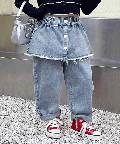 スカートとパンツを組み合わせたユニークなフェイクレイヤードデザインが特徴のデニムパンツ。ゆったりとしたシルエットに加え、ハイウエストでスタイルアップ。ウエスト部分はゴム仕様で着脱が簡単で、動きやすさも抜群です。柔らかく耐久性に優れています。日常使いやお出かけにも最適です。 ユニークでファッショナブルなこのデニムパンツは、Tシャツやジャケットとのコーディネートも楽しめ、親子でお気に入りのアイテムになること間違いなしです。