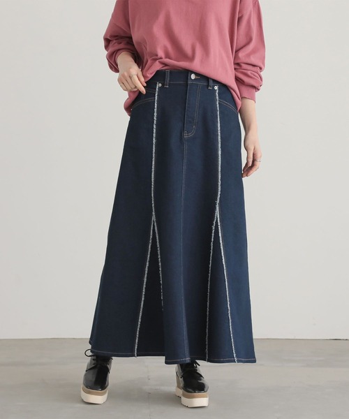 縦切り替えとフリンジディテールを取り入れた、細見えデニムマーメイドスカート。伸縮性のあるコットン混デニム生地で、ストレッチが効いた心地よい穿き心地。程よい厚みの柔らかい生地感なので動きやすく、ロングシーズンの着用に最適です。こだわりのタイトすぎないシルエット。フリンジ切り替えで縦のラインを強調し、フレアなマーメイドシルエットで細見えを実現。ウエスト部分は後ろゴム仕様で楽ちんです。■製品についての注意書きデニム製品につきまして。デニム製品は、『色落ち』も魅力、風合いの一部となっております。染色の特質上、発汗や摩擦により色落ちや色移りする場合や、染料独特のにおいがする場合がございます。気になる場合は、一度お洗濯していただくことをお勧めします。入荷時期によって、色合いや風合いが異なる場合がございます。ご了承の上、ご購入いただきますようお願いいたします。