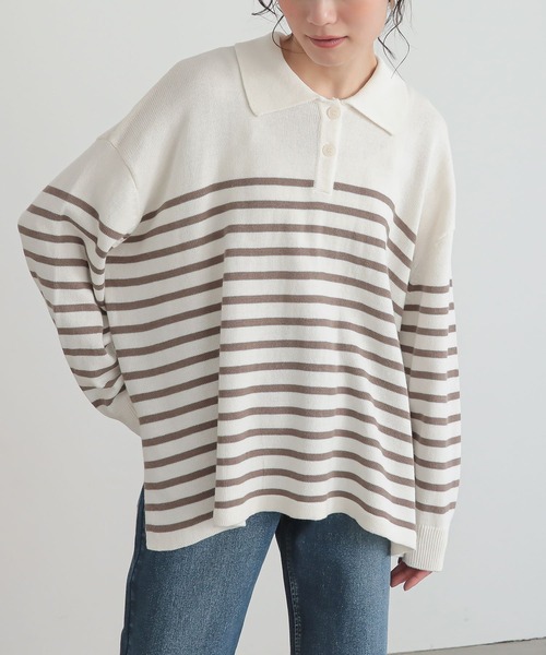 ゆるっとしたシルエットのボーダーニットポロ。体のラインを拾いすぎず、体型カバーを叶えます。 抜け感を演出する両サイドスリットと、前後差のある着丈でお尻まわりをカバーするこだわりのデザインです。 軽やかで伸縮性のあるニット生地を使用。 コットン混素材なので肌にやさしく、薄手でさらりとご着用いただけます。 ■製品についての注意書き ニット製品につきまして。 ニット素材の持つ特性として編み上げる行程やプレス仕上げによって多少サイズや風合いの個体差が生じる場合がございます。 着用した時と実寸の長さが変わる可能性がございます。 また、着用の際ピリングが避けられず、完全に防止することはできません。毛玉取り器等で丁寧に取り除いてください。 ご了承の上、ご購入いただきますようお願いいたします。