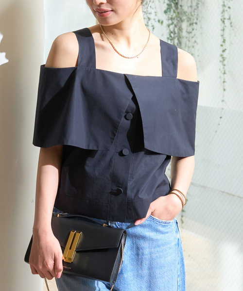 華やかさと女性らしさが漂うデザインのブラウス。 ケープ部分が二の腕を覆うことで、 気になる部分をさりげなく隠しつつ、 オフショルダーのデザインがデコルテや肩まわりを きれいに見せてしっかりと女性らしい印象を与えてくれます。 上半身にボリュームを持たせてくれて華やかでありながら、 リラックスした着心地なので、カジュアルにも少しきれいめにも着こなせます。 大人の抜け感漂うデザイン性が魅力で、 春夏らしいトレンド感あふれるブラウスです。 【注意事項】 ※商品画像は、光の当たり具合やパソコンなどの閲覧環境により、実際の色味と異なって見える場合がございます。あらかじめご了承ください。 ※画像の商品はサンプルです。実際の商品と仕様、加工が若干異なる場合があります。 ※サイズ表記はあくまで目安となります。 ※その他の予約商品、通常商品との同時決済はできません。 ※入荷状況により、お届け予定が前後する場合があります。 ※お客様への発送が店頭販売より遅れる場合もあります。 ※追加生産商品は、一部の店舗、通販で販売中の場合がございます。予めご了承下さい。 ※商品を使用前に、タグ等に記載されている「取り扱い上の注意書き」「洗濯表示」を必ずご確認ください。 ※商品に不良が無い場合、包装紙および箱の彼損がございましても発送いたします。あらかじめご了承ください。