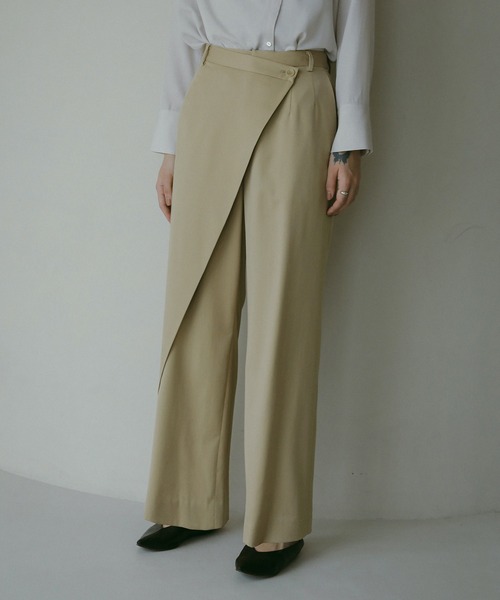 2025 Spring&Summer Collection ラップパンツ ラップデザインのワイドパンツ。 履き心地にもこだわったストレッチ性のある素材を使用し、大きすぎずほど良くゆったりとしたストレートシルエット。 立体的な腰まわりのディテールが気になるお腹まわりもカバーしてくれます。 ラップデザインなのでパンツを主役にトップスはTシャツなどシンプルなアイテムでスタイリングが決まります。 -------------------------------- モデル着用サイズ (BEIGE)175cm /M (BLACK)178cm /M -------------------------------- ※照明の関係により、実際よりも色味が違って見える場合がございます。 またパソコン・スマートフォンなどの環境により、若干製品と画像のカラーが異なる場合もございますので、予めご了承ください。 商品の色味は、商品拡大画像をご参照下さい。