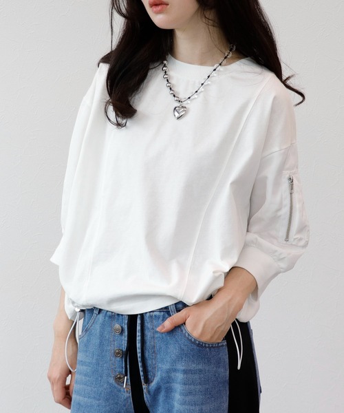 甘辛な印象のMA-1デザイントップス登場!袖のMA-1デザインと、裾のドロストがポイント。様々なボトムと相性抜群です◎気温が上がってきたら1枚着で◎ 肌寒いときはアウターの中に。ロングシーズンで着ていただけます◎ --------------------------------------透け感:オフ/ややあり裏地:なし伸縮性:ややありケア方法:洗濯機可※お洗濯の際は洗濯表示を必ずご確認ください。--------------------------------------