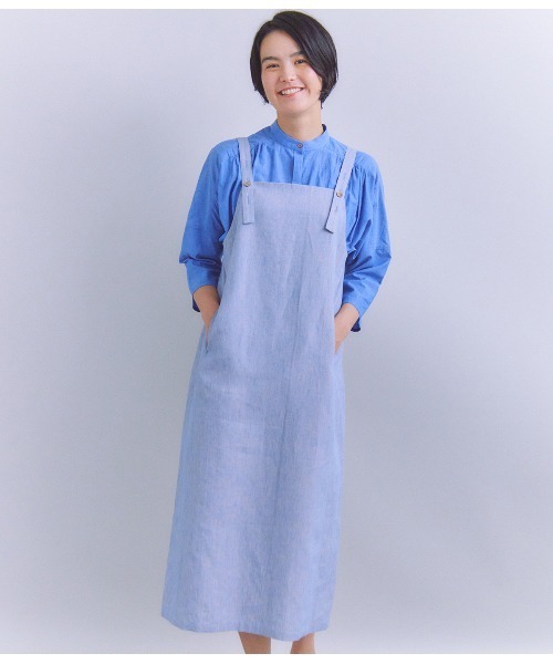 リネンのナチュラルな風合い ■素材 オランダの有名リネンメーカーのNORTHERN LINEN社の高級リネンを使用。ポリエステルとリネンを染め分けてシャンブレー配色にしています。リネン特有のごわつきを少なくした、程よいハリのある素材です。 ■デザイン ボックスシルエットのジャンパースカート。2025年春夏のシーズンテーマ「Botanical Garden」から、庭仕事で着用するような、ガーデニングエプロンをイメージしデザインに落とし込みました。サイドに切り替えを入れることで、リネン特有のハリ感を活かした、綺麗なボックスシルエットに。裾にはスリットを入れ、程よい抜け感をプラスしました。バックサイドにはミニポケットを付け、さりげないアクセントに。肩紐は釦で長さの調節が可能で、着丈の調節はもちろん、紐を長くするとより大人な印象に見せられます。ポケットあり。裏地なし。 ■カラー 春夏のカラーに馴染むブラウン、鮮やかなブルーの2色展開。 ■シーズン 2025年春夏商品 ─────────────── 透け感:なし 生地の厚さ:普通 伸縮性:なし 裏地:なし ───────────────