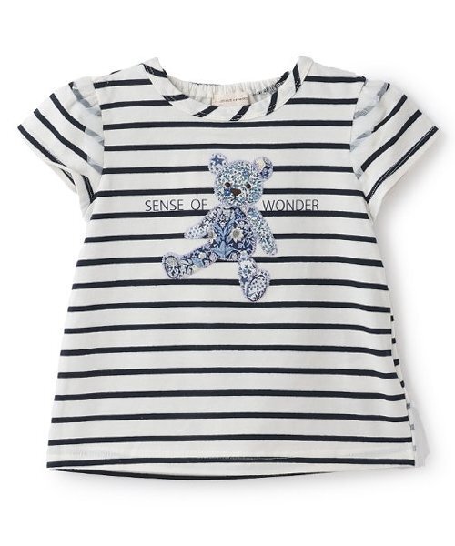 胸元にほどこしたクマのアップリケ刺しゅうが目を引くTシャツです。3種類のリバティファブリックを組み合わせた魅力あふれるデザイン。袖切り替え部分にはチュールフリルを挟みました。バックネックはお着替えしやすいゴム仕様。ベーシックな雰囲気で、デイリー使いに重宝します。内側にお名前を記入できるタグつき。【透け感】透けない【生地の厚さ】普通【伸縮性】あり【裏地】なし【ポケット】なし【アジャスター】なし