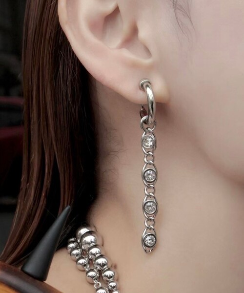 <Soierie>クリスタルガラスが揺れて輝くモダンなイヤリング ■デザイン 工業的なダークトーンのシルバーカラーで作製したシリーズのイヤリング。 一粒モチーフを連ねたデザインは耳元で存在感を発揮するアイテム。 クリップタイプで、イヤーカフとして軟骨溝にも着用可能な2WAY仕様です。 シンプルなコーディネートにプラスするだけで華やかな印象に導いてくれる一品です。 ■素材 真鍮(合金メッキ)、クリスタルガラス <Soierie(ソワリー)> 2009年よりスタートした、コスチュームジュエリーブランド<Soierie>。 ブランド名はフランスにある絹の産地名から由来しており、過去と未来、異素材など相反する要素を織り交ぜたジュエリーを作ることから、“時を紡ぐ”をブランドコンセプトとしております。 常に洋服とのスタイリングを意識し、着用時のバランスを計算しプロダクトされているコスチュームジュエリーです。 ジュエリーによって、洋服という普遍的な物に驚きと輝きをもたらせたらと願い製作しております。 【注意事項】 ※商品を使用前に、タグ等に記載されている「取り扱い上の注意書き」、「洗濯表示」を必ずご確認ください。 ※商品画像は、光の当たり具合やパソコンなどの閲覧環境により、実際の色味と異なって見える場合がございます。あらかじめご了承ください。 ※商品の色味の目安は、商品単体の画像をご参照ください。 店舗へお問い合わせの際は、全国のBEAUTY&YOUTH各店舗まで下記の品名/品番をお申し付けください。 品名:BL SOIERIE DARK MTL E/CF 品番:18335990498