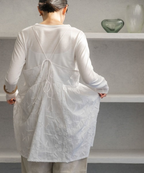 立体的な刺繍が施された生地が魅力のキャミソールブラウス。 華やかな表情をプラスしつつ、上品な雰囲気を演出してくれる一着です。 肩紐は調節可能なため、自分に合ったフィット感に調整できるのも嬉しいポイント。 更に、後ろのリボンがポイントになり、バックスタイルまで抜かりのないデザインに仕上げました。 着心地を叶えつつ、シンプルなインナーとのレイヤードスタイルを楽しめるのが魅力。 Tシャツだけでなく、タートルネックやシアートップスと合わせることで、シーズン全体でコーディネートが可能です。 【2025 Spring/Summer】【25SS】 ※この商品は、インドで素材調達、縫製を行っています。素材の特性上、多少の色差、織ムラ、フシなどがあります。 ※刺しゅう部分は引っ掛かりやすいのでご注意ください。 ※その他お取り扱いに関しましては、商品に付属のアテンションタグをご覧ください。 ※商品画像は、光の当たり具合やパソコンなどの閲覧環境により、実際の色味と異なって見える場合がございます。予めご了承ください。 ※商品の色味の目安は、商品単体の画像をご参照ください。 ▼お気に入り登録のおすすめ▼ お気に入り登録商品は、マイページにて現在の価格情報や在庫状況の確認が可能です。 お買い物リストの管理に是非ご利用下さい。 素材感 透け感 : ややあり 伸縮性 : なし 裏地 : なし 光沢 : なし ポケット : なし M