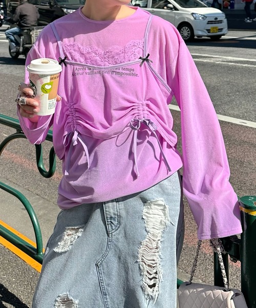 ロンTとキャミがセットになったお得なアイテム! 別々でも着られる優秀アイテムは1つ持っておくと◎ ▼デザイン ・ドロストレースが調整できるのでお好きなシルエットでお楽しみいただけます ・1枚で完成するのでコーデに迷った朝にぴったり! ・合わせやすいオフホワイトと女子っぽいラベンダーのカラーをご用意しました ・別々でも着られるセットアイテムは着回し力抜群♩ ・長すぎず短すぎない丈感なのでボトムを選ばず着ていただけます◎ ▼コーディネート ・サラッと着られるアイテムは、ボトムにボリュームを持たせるとシルエットが決まりやすい! ・薄めの素材感なので肌寒い日はカーディガンを羽織ってもゴワつかず着ていただけます ・キャミ部分は取り外してジャージとレイヤードすると◎ ・使いまわし抜群のロンTは、ワンピースやサロペットのインナーとして大活躍すること間違いなし! -------------------- 裏地:なし 透け感:少しあり 厚さ:薄め 伸縮性:あり -------------------- ※可能な限り実物に近いカラーにて掲載しておりますが、 ご使用のパソコンおよび携帯電話の閲覧環境によっては、 実際の色味と異なって見える場合がございます。予めご了承ください。 ※詳しいお手入れ方法は商品タグをご参照ください。 【最新情報はinstagramをチェック!】 ★Alley Tokyo 公式instagram @alleytokyo ★Alley Tokyo Director @hanai_chi7997 【お買いものにおすすめの便利機能!】 ★商品のお気に入り登録 完売カラーの再入荷の時や、ラスト1点の時、セールになった時にお知らせします。 ★ブランドのお気に入り登録 商品や再入荷、セール情報など、いち早くブランドのお得な情報を受け取ることができます。 ぜひご活用ください!