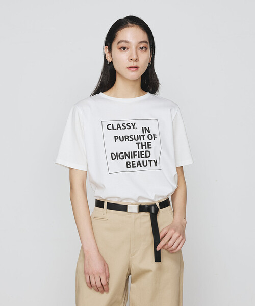 《デザイン》新パーパスTシャツの登場です。型は丸首のベーシックなデザインです。コムサのパーパスである「上品、上質、シンプルに、しかしありきたりではなく凛とした美しさを極めたい。」の文章から重要ワードをピックした図案です。四角いフレームで単語を囲むことで、プリントの雰囲気を引き締めています。中の単語の配置も最も良く見える位置を追及しています。T/W2WAYストレッチ(商品番号:15-03JK03-205)のジャケットのも着合わせられるようにプリントの位置を設定しています。シロ地にクロプリント、サックスにシロプリントで爽やかに、クロにグレープリントでモードに着られます。《素材》スーピマ―コットンを使用したハイゲージで編み立てたポンチです。余分な毛羽を取り除き、強シルケット加工で光沢を引き出しています。お手入れ方法:手洗いOK