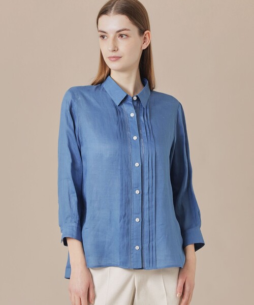 【ウォッシャブル】【着用推奨シーズン:春・夏】 <素材説明> 160番の細番手ラミー糸を使用した素材です。細番手ならではの光沢感と繊細な透け感があり、ラミーの程よいシャリ感が肌触りの良さと清涼感を演出しています。 <デザインポイント> 程よくゆとりのあるシルエットでリラックス感のあるラミーのブラウスです。フロントのピコ刺しゅうとタックのディテールを生かしジャケットのインナーとして、また前を開けて羽織としても活躍します。 ※この商品はサンプルで撮影を行っています。実際の商品とイメージ、仕様等が異なる場合がございますので予めご了承ください。