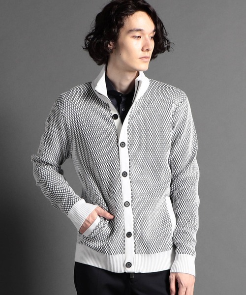 ジオメトリックジャカード スタンドニットブルゾン■素材表面は肌触りのよい綿アクリル素材。裏面にストレッチ性のあるポリエステル糸を使用して型崩れしにくい安定感のある編地に仕上げています。伸縮性の異なる糸を使用することで凹凸感のあるジオメトリック柄を表現しました。■デザインしっかりと立つ度詰めリブのスタンドカラーが特徴のニットブルゾン。フロントはZIP-UP+釦のダブル仕様。肉厚感がありながら軽く、秋~春まで着用していただけます。秋はカットソーやシャツの羽織りに、冬はブルゾンやコートの下で活躍します。透け感:なし伸縮性:あり生地の厚さ:やや厚手裏地:なし※カラーについて09ホワイト・18ベージュ:2色の糸でジオメトリック柄を際立たせています。39チャコール・67ネイビー:2色の糸をミックスしてメランジ感を表現。49ブラック:凹凸感のある編地を単色でシックにまとめています。※画像の商品はサンプルです。実際の商品とは仕様・加工・サイズ・素材が若干異なる場合がございます。※照明の関係により、実際よりも色味が違って見える場合があります。またパソコン・スマートフォンなどの環境により、実際の商品と色味に若干の誤差が生じる場合があります。予めご了承ください。