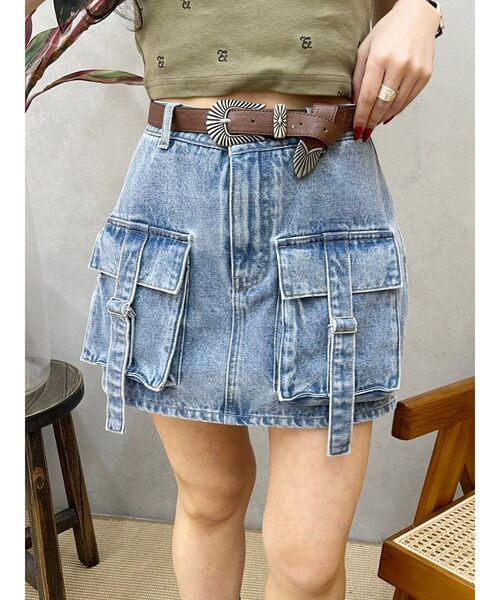 ■デザイン トレンドのカーゴポケット付のデニムミニスカートです。インナーショートパンツで安心して着用できます。 ポケットのベルト部分はわざと長めにしており、程よいデザイン性をいれています。 ■スタイリング Tシャツ合わせでカジュアルに着るのはもちろん、 シアートップスなどキレイ目コーデにもおすすめです。 -------------- 透け感:なし 裏地:あり(インナーショートパンツ) 生地の厚み:普通 伸縮性:なし --------------