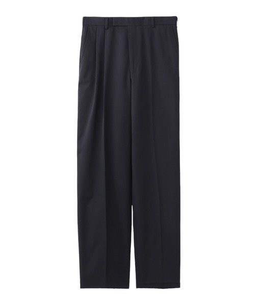 左右で太さとシルエットが違うアシンメトリー2タックトラウザーズ。右足は2タックテーパードワイドシルエット、左足がノータックストレートシルエットの特徴的なデザイン。耐久性が高くなめらかでしなやかな手触りで、ほどよい光沢感のあるウールコットン素材。