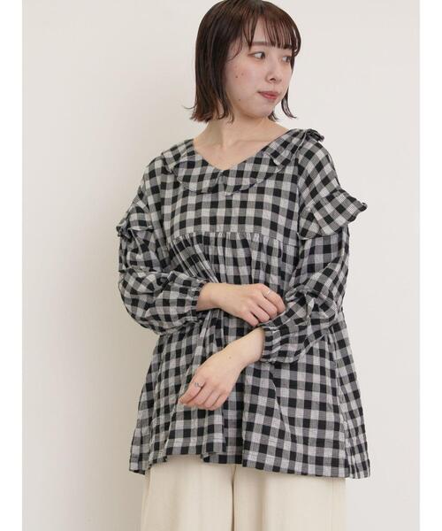 襟に施されたフリルが可愛らしいアクセントになるチュニック。 首元は緩やかなVネックになっており、スタイリングにやさしい印象を与えます。 ウエストラインを高く見せる切り替えがポイント。 デニムパンツと合わせたカジュアルな装いもおすすめです。 ※商品画像は、撮影環境やお客様のご利用のPC・スマートフォンのモニター環境などにより実物と色味に差異がある場合がございます。