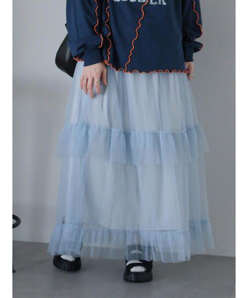 フリルをあしらったティアードデザインが華やかで可愛らしいスカート。ふわりと揺れるエアリーなチュールを使用し、女性らしい可憐な表情を演出。ウエストはゴムギャザー仕様になっており、安心感のある穿き心地に。Tシャツやスニーカーを合わせてカジュアルやスポーティMIXにスタイリングするのもおすすめです。※商品画像は、撮影環境やお客様のご利用のPC・スマートフォンのモニター環境などにより実物と色味に差異がある場合がございます。【その他採寸】F ウエスト:[ゴム仕様]64cm