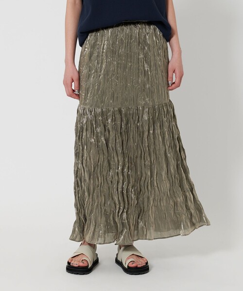 艶&ランダムプリーツでシーズンスタイルを華やかに演出 ■デザイン 光沢×しわ加工の入った表情豊かな素材を使用した、ボリューム感のあるティアードスカート。 ウエストから切替にかけてボディラインが綺麗に見えるすっきりめのシルエット。 裾のボリュームをたっぷりとつけてメリハリを出しドラマチックなラインに仕上げました。 ウエストゴムのはき心地の良さもデイリーに嬉しいポイント。 艶やかな表情で、大人のモードな着こなしに導きます。 ■素材 強めの光沢感×シワ感がミックスされたトレンド素材。 オリーブはシャンブレーで見える角度によって奥行のある色味が特徴です。 ご自宅で手洗い可能な利便性も魅力。 ■コーディネート ノースリーブスウェットなど、カジュアルアイテムとのミックスコーデもおすすめ。 コンパクトなニットやカットソーなどと合わせればフェミニンな印象で着こなせます。 ============================ 裏地:あり 透け感:ややあり 伸縮:なし 光沢感:ややあり ケア方法:手洗い可 ============================ 【注意事項】 ※商品を使用前に、タグ等に記載されている「取り扱い上の注意書き」、「洗濯表示」を必ずご確認ください。 ※商品画像は、光の当たり具合やパソコンなどの閲覧環境により、実際の色味と異なって見える場合がございます。あらかじめご了承ください。 ※商品の色味の目安は、商品単体の画像をご参照ください。 店舗へお問い合わせの際は、全国のBEAUTY&YOUTH各店舗まで下記の品名/品番をお申し付けください。 品名:BL P SHINY TRD LNG 品番:16241623921