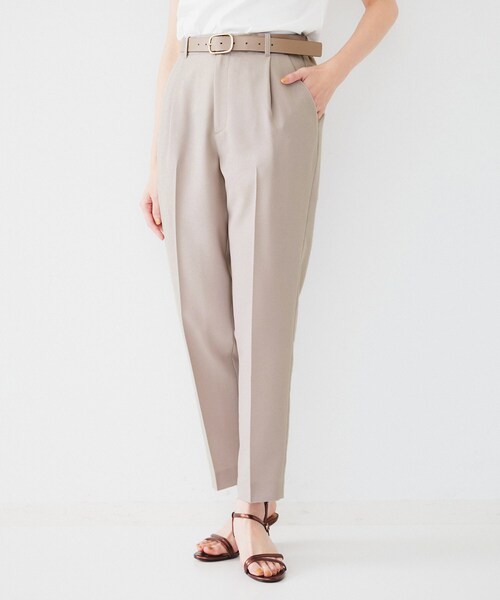【デザイン】人気シリーズがイージーケア・接触冷感・UVケアと多機能付きアイテムへと進化して登場です!定番のタックテーパードパンツです。シーズン長く穿きやすく、洗濯機洗いもできるのも嬉しいポイントです。【素材感】ウールの長所とポリエステルの長所を融合したハイブリットな糸(トリクシオン)を使用した梳毛調合繊。ウォータージェットという織り機で糸を織る段階で水を使い、従来のものよりも膨らみが出る機械を使用しております。スーツ地っぽいのにジャージのような着心地とキックバックの良いストレッチ性と反撥性が特徴です。更に仕上げに特殊な加工を施し、マスクメロンのような表情の細かいシワと少し天日干し調のナチュラルなシワをミックスして仕上げております。綺麗めなのにかっちりしすぎない、でもカジュアルすぎない少しリラックス感もある新感覚の素材となっております。【着こなしポイント】同素材のダブルブレストジャケット(153-42403)とジレ(153-42404)とのセットアップです。シンプルなデザインなのでニットやブラウスなどと合わせて、オフィスシーンにもおすすめなアイテムです。【仕様】・ポケット数:横×2 後ろ×2・前ファスナー・ウエスト後ろゴム・裏地なし※ベージュ(052)はやや透け感があるため、インナーの着用をおすすめします。※この製品は、太陽光線中の紫外線(UV)を通しにくくします。この効果は永久的ではありません。※照明の関係により、実際よりも色味が違って見える場合があります。また、パソコン・スマートフォンなどの環境により、若干製品と画像のカラーが異なる場合もございます。モデル情報:身長163cm B80 W59 H82 着用サイズ:02(M)店舗へのお問い合わせ商品番号:153-62403●製品寸法:00(XS):W65cm H95cm 股下62cm 渡り幅30cm 裾幅14cm01(S):W68cm H98cm 股下66cm 渡り幅31cm 裾幅15cm02(M):W72cm H102cm 股下66cm 渡り幅32cm 裾幅16cm03(L):W75cm H105cm 股下67cm 渡り幅33cm 裾幅17cm04(2LT):W78cm H108cm 股下67cm 渡り幅34cm 裾幅17cm42(2L):W82cm H111cm 股下67cm 渡り幅35cm 裾幅19cm44(3L):W86cm H115cm 股下67cm 渡り幅37cm 裾幅19cm46(4L):W90cm H119cm 股下67cm 渡り幅38cm 裾幅20cm48(5L):W94cm H123cm 股下67cm 渡り幅39cm 裾幅20cm50(6L):W98cm H127cm 股下67cm 渡り幅40cm 裾幅21cm備考: