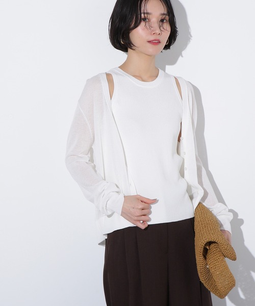 アメリカンスリーブのリブ編みタンクトップとシアーカーディガンのアンサンブルです。それぞれ編地を変えているのでSETで着用したときに単調にならない着こなしが完成。カジュアルにもキレイめにも合わせやすく、それぞれ単品使いもできるため、コーディネートの幅が広がります。<素材>アメスリタンクは透け感のないリブニット、カーディガンはシアーの天竺素材を使用しています。<詳細>仕様・前ボタン裏地・なし透け感・あり / 光沢・なし / 伸縮性・あり生地の厚さ・普通●取り扱いについては、商品についている品質表示でご確認ください。●撮影はサンプル商品で行っている為、仕様とサイズが異なる場合がございます。●スタジオ及び屋外で撮影した着用画像は、光の当たり具合やご覧のモニターによって色味が違って見える場合があります。予めご了承ください。●生産時期により色・素材・サイズ感など多少異なる場合がございます。予めご了承ください。≪お買い物をよりお楽しみいただくために!≫・「商品のお気に入り登録」再入荷通知や、ラストの通知、セール通知も受け取ることができます。・「ブランドのお気に入り登録」新商品や再入荷をはじめ、タイムセールやクーポンなどいち早くブランドお得な情報を受け取ることができます。