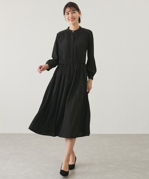 【デザイン・シルエット】 パウダーサテンの上品な生地が大人可愛いを叶えるワンピース。 襟元や袖口のパールボタンがレディなポイントに。 襟元のボタンを外すとスキッパーデザインで抜け感をプラスします。 程よいフレアシルエットで歩くたび上品に揺れる一枚です。 【素材感】 柔らかいパウダーサテン生地 【カラー】 01クロ 09グレー 33ライトグリーン 40 コン 【スタイリングポイント】 一枚でさらっと。 ベストやアウター、カーディガンなど幅広く羽織を合わせていただけます。 裏地:あり 光沢感:若干あり 透け感:グレー若干あり ポケット:なし 伸縮性:なし 生地の厚さ:普通 ボタン:あり その他仕様:なし 季節:春秋冬 ※撮影時の光、お使いのモニター環境によって色の見え方が違う場合がございます。予めご了承ください。 モデル身長:168cm 着用サイズ:M