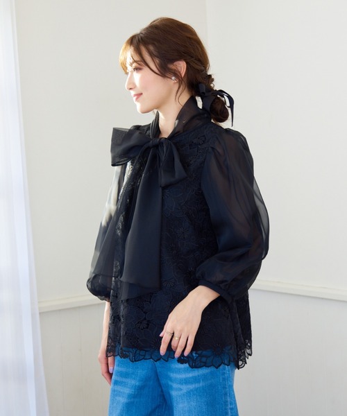 オーガンジーとチュールを重ねたボリュームスリーブがフェミニンなリボンタイブラウス。肩を内側に入れ、ギャザーで立体的なボリュームを出した袖が顔回りや上半身を華奢見えに。シアーな質感と刺繍が上品な、華やかアイテムです。オーガンジーのリボンがボリュームを出しつつ、エアリーな軽さが春らしく可愛いアクセントに。デイリーにはもちろん、オケージョンシーンにもおすすめです。サイズ展開も豊富にご用意。自分サイズできれいに着用できます。オフホワイト、ブラックの全2色。************************************生地感: 普通伸縮性: なし透け感: 袖あり裏 地: 袖のみ裏なし洗 濯: ドライクリーニング************************************モデル身長: 166cm/ 38号着用詳細着用モデル身長 161cm / 着用サイズ 38号*取り扱いについては、商品についている品質表示でご確認ください。*撮影環境により、実際と色味が違って見える場合があります。また、PC・スマートフォンなどにより、製品と画像のカラーが異なる場合もございます。*商品画像はサンプルのため、色味やサイズ、プリント位置、仕様などに変更がある場合があります。*50号は一部の店舗・ONLINE SHOPのみの展開となります。取扱いしていないサイトもございますのでご了承ください。【RoseTiara/ローズティアラ】フェミニンな愛らしさと、大人のエレガンスを一度にまとう服。「可愛い」をずっと手放さない、あなたのためのブランドです。素材選びからデザイン、パターンまでを一貫して行い、タックの向きやギャザー分量、フリル位置などを36・38・40号と42・46・50号では調整し、パターンを分けることで美しいシルエットと着心地の良い服を提案します。