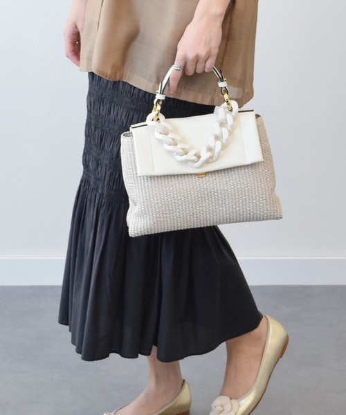 【LORISTELLA/ ロリステッラ】 2002年イタリア、アブルッツォ州にて創業されたブランド、ロリステッラ。 デザイン、パターン、ファブリック、縫製まで徹底したMade in italyにこだわり、モダンでスタイリッシュなフォルムにフェミニンな要素を取り入れたデザインは欧州を中心にとても人気があります。 レザーと涼しげな雑材を使用したハンドバッグは同系色のアクリルチェーンがフェミニンな印象です。※ショルダーストラップ付 [メーカー参考型番]2599P JILL ※生産過程に生じるキズが多少ある場合がございます。また素材の特性上、若干の色ムラ、擦れが見られる場合がございますが、こちらは素材の特性となります。予めご了承下さい。 ※サイズ換算(表記)はあくまで目安となります。