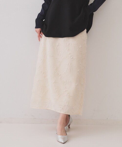 《andGIRL春号掲載》 華やかなフリンジジャカード素材を使用したナロースカート 【デザイン】 ・すっきりとしたシルエットが魅力のナロースカート。 ・華やかな素材を活かしたシンプルなデザインがポイント。 ・ウエストの後ろにはゴムを入れており、フィット感や着心地も◎です。 ・お仕事にはもちろん、お出かけにもオススメの上品なスカートです。 【素材】 ・毛足の長すぎないフリンジジャカードで、きれいめに着こなせる素材感。 ・ご家庭でお手入れ可能なハンドウォッシャブル。 【仕様】 ・裏地あり ・ポケットなし ・ウエスト後ろゴム ・左脇ファスナー仕様 ※こちらの商品はやや透け感があります。 ※照明の関係により、実際よりも色味が違って見える場合があります。また、パソコン・スマートフォンなどの環境により、若干製品と画像のカラーが異なる場合もございます。 モデル情報:身長165cm B72 W57 H84 着用サイズ:38(M) 店舗へのお問い合わせ商品番号:637-72020 ●製品寸法: 38(M):W66~70cm H88cm 総丈85cm 40(L):W69~73cm H91cm 総丈86cm 42(LL):W72~76cm H94cm 総丈88cm 備考: