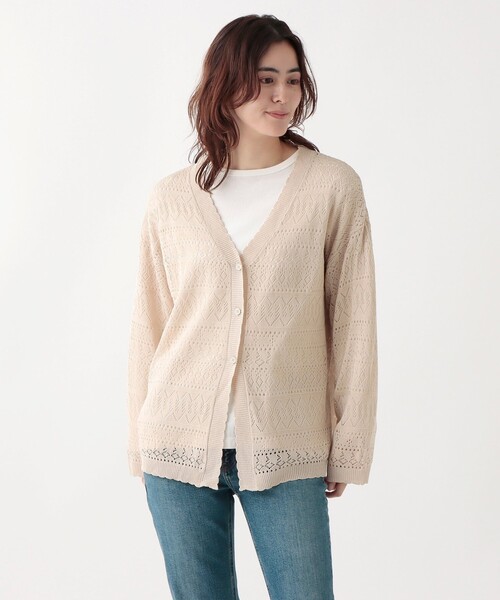 繊細な透かし編みのニットを使用したカーディガンです。まるでレースのようなデザインで、スタイリングに華やかな印象をプラスします。インナーをレイヤードしても着ぶくれしにくい、ゆったりとしたサイズ感で仕上げました。腰丈までかかる着丈で設計しており、体型カバーにも役立つアイテムです。ふちのスカラップデザインがさりげないアクセント。風通しが良いので汗をかいても肌に張り付きにくく、あたたかい時期でも快適に着こなせます。そのままさらっと羽織るスタイルはもちろんのこと、ボタンを全て留めてボトムインして着用するのもおすすめです。濃色製品は色落ちしますので他のものと分けて洗濯してください。洗濯前のつけ置きや濡れたままで長時間放置しないでください。洗濯の際はネットを使用してください。アイロンを掛ける際はあて布を使用してください。1点ごとに柄の出方が違うことがあります。