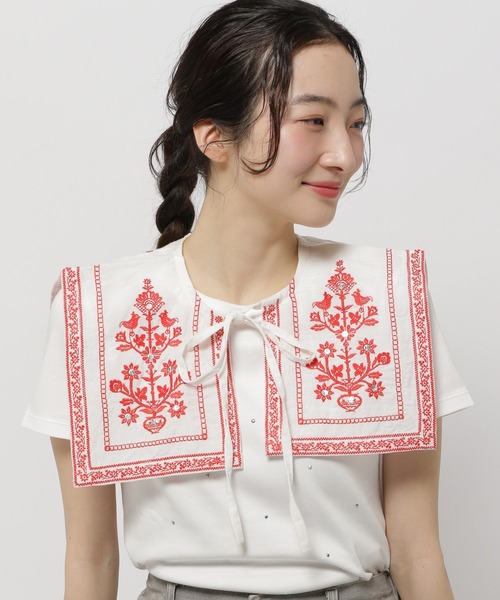 ナチュラルな風合いのプラスワン小物 リネンの柔らかい素材に繊細な刺繍が施された付け襟。 シンプルなカットソーやニット、スウェット、ワンピースなどにONするだけでコーディネートが完成するアイテムです。 あたたかみのある風合いも楽しめて、季節問わず気軽に取り入れていただけます。