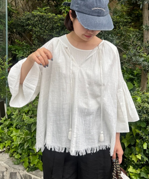 インド綿の風合いの良さ、拘りの刺繍がお洒落さを格上げしてくれる TYPYで人気のちょっと贅沢な【From India】 裾フリンジがこなれ感を演出♩ 2WAYで着回せる大人かわいいブラウス ■デザイン ふわっとしたバルーン袖が、女性らしさをプラスしてくれるブラウス。 存在感ある裾のフリンジデザインが、こなれ感を演出してくれます。 ゆとりのあるサイズ感なので、さりげなく体型カバーできるのも嬉しいポイント◎ さらっとした綿素材のため、汗ばむ季節も快適! 前後2WAY仕様で、その日の気分で違った雰囲気を楽しむことができます♩ ■スタイリング 王道のデニムパンツと合わせて、大人カジュアルコーデはもちろん、 チノパンツやカラーパンツとも相性抜群です♩ ボリュームのあるトップスなので、ボトムはワイド過ぎないアイテムと合わせるのが◎ ■お手入れ方法 洗濯:洗濯ネットを使用し、液温30℃を限度とし洗濯機で非常に弱い洗濯ができる タンブル乾燥:不可 アイロン:あて布を使用し、底面温度110℃を限度としてアイロン仕上げができる ・・・・・・・・・・・・・・・・・・・・・・ 透け感:ややあり 裏地:なし 伸縮性:なし 光沢感:なし 生地の厚さ:薄手 ・・・・・・・・・・・・・・・・・・・・・・ ▼気になる商品をお気に入り登録 ハートをクリックして《お気に入り登録》がオススメです! ※画像の商品はサンプルを使用しております。実際の商品と若干の仕様が変更になる場合がございますので、予めご了承の上ご注文くださいますようお願いいたします ※屋外の光や照明の当たり具合で、実際の商品の色味とカラー別画像の色味に若干の違いが発生する場合がございます。詳細画像と併せてご確認の上、ご注文いただきますようお願い致します。 ※独自のタイムセールなどの施策により、実店舗と価格差が発生する場合がございます。 ※実際の店舗在庫につきましては、各店舗に直接お問い合わせください。 ※他のキャンペーンにより、期間中に価格が変動する場合があります。 ※セールは予告なく終了させていただく場合もあります。