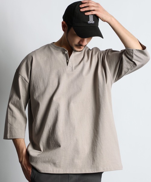 "使い勝手の良いシンプルヘンリーTEE" 【生地】 独自に開発した14番糸(8oz)という太糸で編んだ天竺素材を使用しています。 中肉厚な生地で透けづらく、程よくガッシリとしたタフな素材感が、素朴だけど高級感のある仕上がりとなっています。 【デザイン・ディテール】 ショルダーラインを落し、程良く身頃にゆとりを持たせたリラックスシルエット。 前立て(ボタン部分)を短くしたヘンリーネックデザインで、ボタン全開で着用したときも首元がだらしなくならないよう配慮しています。 その他、ワンポイントロゴをさり気ない位置に使用しており、一見シンプルながら拘ったデザインに仕上げています。 ※サンプルを着用しておりますので、実際の商品と仕様、加工、サイズが若干異なる場合がございます。 ※撮影環境による光の当たり具合やパソコン・スマートフォンなどの閲覧環境によって、実際の色味と異なって見える場合がありますので予めご了承ください。 ※商品の色味は商品単体で撮影した画像をご参照ください。