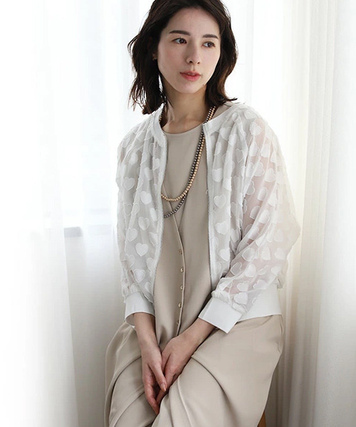シアー感のあるハートジャガードブルゾン。 甘くなり過ぎずフェミニンさをプラスできる アイテム。日除け対策にも重宝すること間違いなし! カジュアルにもキレイめにも使える1枚です。 [サイズ(cm)] FREE:総丈58 バスト100 裄丈66 [お手入れ方法] 手洗いにてお手入れしてください。