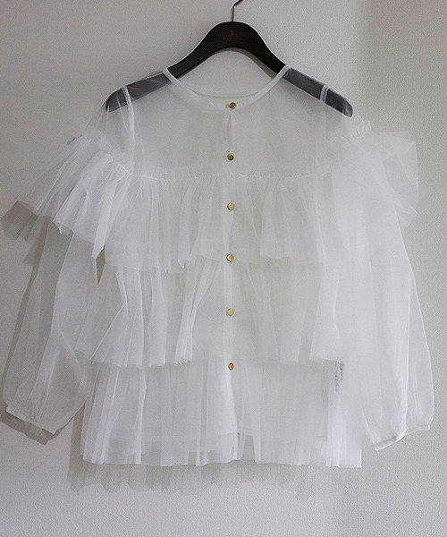 大人フェミニンなチュールトップス。ティアードデザインでたっぷりチュールを使ったシアー感のあるフェミニントップス。ディテールが甘めなので、カラーはシックに。前をあけて羽織として着るのもオススメです。前後どちらでも着用可能◎ [サイズ(cm)]M:総丈63 バスト100 裄丈69 [お手入れ方法]クリーニングネット使用にてお手入れしてください。