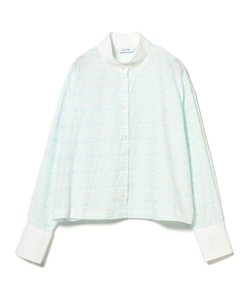 クラシカルな雰囲気漂う存在感 ■デザイン クラシカルなスタンドカラーと長めのカフスが特徴的なデザインのブラウス。 身幅が広いボックスシルエットで、リラックス感のある着心地。 手描き風のラフな波模様とほどよい透け感が魅力。 襟とカフスの白がアクセントになってます。バランスの取りやすい短めの着丈でパンツやスカートなど様々なボトムスと合わせやすくスタイリングしやすい1枚です。 ■素材 〈SETTO〉オリジナルの「波柄ドビー素材」を使用。 ドビー織りによる立体的な美しさが特徴。 ほどよい透け感に波模様が穏やかに浮かび上がる上品な生地。 コットン100%で肌に優しく、快適な着心地。 ■ケア方法 水洗い・ドライクリーニング両方可 (詳細は商品についている品質表示ラベルをご覧ください) SETTO 2014年に岡山県・児島のテキスタイルメーカーがスタートしたファッションブランド。素材の開発からがデザインと捉え、糸・生地・色・形にこだわった商品を瀬戸内海の町から提案しています。本質を重んじ、ひとつの妥協も無く、ただ実直にものづくりを続けています。