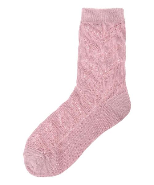 葉っぱ柄の透かし編みが足元のアクセントになるソックス。コットンベースのふんわりとした素材で、履き心地の良さを演出します。スタイリングに取り入れやすいカラーや、コーデのワンポイントになるバリエーション展開にも注目。ワンピースやスカートスタイルに取り入れた着こなしがおすすめです。【その他採寸】F 全長:16cm