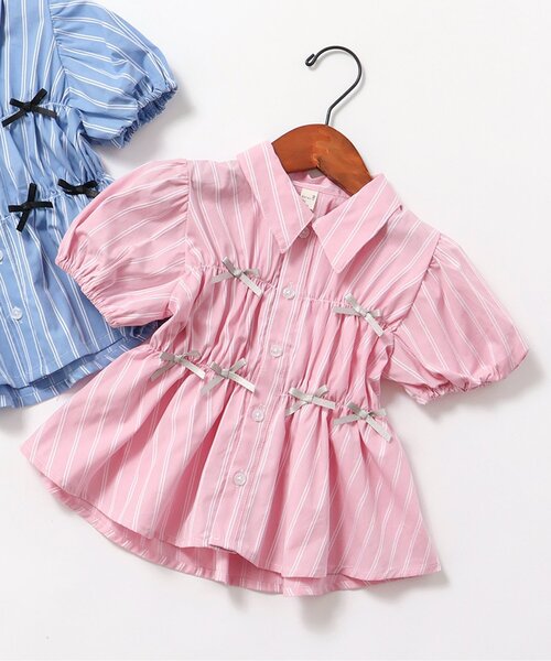 着るだけ簡単おしゃれ見え♡この1枚を着るだけでおしゃれ上級者!?この夏おすすめのストライプシャーリングリボンチュニック*襟のきちんときれいめ感・・トレンドの細めりぼんをあしらったデザインにぽわんとお袖がキュート♪かわいらしさときれいさの両方を兼ね備えたおしゃれなお姉さんスタイルに◎普段使いはもちろん、通園通学にもおすすめ半袖シャツです。【取り扱い表示】40℃を上限に洗濯機で洗濯、デリケートアイテムモード、ネット使用、漂白剤を使用禁止、色物は同系の色と一緒に、洗濯後直ちに取出し、タンブル乾燥不可、日陰で吊り干し、低温でアイロン、商業ドライクリーニング不可※商品により多少の誤差が生じる事がございます。あらかじめご了承下さい。※ご使用のパソコンやブラウザの環境により、実際の色とは多少異なる場合がございます。※モデル着用写真についてはイメージの為、実際の商品とカラーや仕様が異なる場合がございますので、商品画像をご覧ください。【 apres les cours -アプレレクール- 】「キオク いろどる、こどもふく。」大切なキオクを彩る、お気に入りの一枚。「アプレ レ クール」は独自の色づかいやテキスタイルで日々をトクベツに過ごせるそんな「一枚」をお届けします。