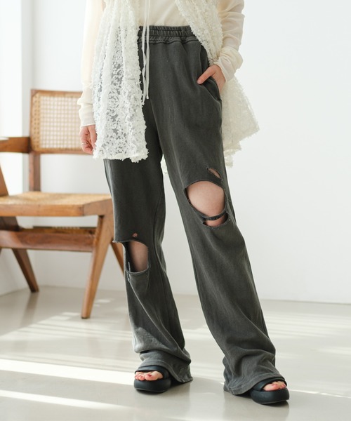 ラフに履けてトレンドなお洒落が叶う ※サイズ0と1の着丈の差は8cmです。(詳しくはサイズ詳細をご覧ください) ※加工の特性上、サイズや色に多少の個体差があります。 ■デザイン 韓国風のスタイリングが楽しめるスウェットパンツが登場。 ダメージ入りなので抜け感もありオシャレに穿いていただけるデザインです。 落ち感があり華奢見えも叶えてくれるシルエット。 ウエストゴムで脱ぎ着しやすく着心地も◎内側には紐付きなので絞ることで調節していただけます。 ■生地感 厚手過ぎないスウェット素材でロングシーズン履いていただける生地感。 ■コーディネート スポーティな印象のアイテムなので、キャミソールにシアーシャツやブラウスを羽織るなど 女性らしいアイテムを合わせたり、肌みせを意識してスタイリングしていただくのがオススメです。 クロップド丈などスッキリ見えるアイテムだとよりスタイルアップします。 ■推奨サイズ 153cm~158cm前後 サイズ0 160cm~166cm前後 サイズ1 ■スタッフレビュー 【153cm / 骨格ウェーブ(サイズ0着用)】 ハイウエストの位置ではけて、ダメージが入っているのでダル着感がですぎずおしゃれ見えします! 【158cm / 骨格ストレート(サイズ1着用)】 ダメージも程よいので履きやすいです。腰回りが少しソワソワするので丈が長めなものとレイヤードがオススメ。 【163cm / 骨格ナチュラル(サイズ1着用)】 163cmで靴にかかるくらいの丈でした。ワイドすぎない綺麗なシルエットなのでトップスを選ばずに履けます。 ■素材・洗濯表示 素材:【グレー】綿60%,ポリエステル40%【ブラック】綿100% 洗濯:手洗いまたは洗濯ネットに入れ洗濯機の手洗いコースで洗濯可能 タンブル乾燥:不可 アイロン:【グレー】150℃まで【ブラック】110℃まで ●漂白剤入り、蛍光増白剤入りの洗剤及び漂白剤のご使用はお避け下さい。 ●長時間のつけ置きや、濡れたままの放置は避け、洗濯後素早く干してください。 ●洗濯の際は色落ちしますので、他のものと分けて単独で洗ってください。 ●アイロンの際は当て布をして裏から当ててください。 ●揉み洗いはお避けください。部分的に白化する恐れがあります。 ●洗濯後はよく形を整えて干して下さい。 ●雨や汗で湿った状態で着用すると色落ちすることがありますので、ご注意下さい。 ●この製品は、風合いを出すために後加工を施していますので、色・サイズ等に多少のばらつきがあります。 ●強い日光(又は照明)を長時間受けますと変色の恐れがありますので、着用及び保管の際はご注意ください。 ●1枚1枚ダメージ加工をしているため、それぞれ若干の差があります。また、着用や洗濯の繰り返しで徐々に加工の程度が進行します。(穴、ほつれ等) ●素材の特性上、ピリング(毛玉)が発生する恐れがあります。ピリングが出来ましたら、引っ張って取らずに小さなハサミで一つ一つ切るか、毛玉取り機を使用して取り除いてください。 ※サイズ採寸は各モールによって異なり、多少の誤差が生じる可能性がありますのでご了承ください。 ※商品画像はサンプル品を使用しているため、実際の商品と仕様、加工、サイズが若干異なる場合がございます。 また、可能な限り実物に近いカラーにて掲載していますが、使用しているパソコンのモニター設定や、携帯電話のメーカー・機種により実際のカラーと異なって見える場合がございます。予めご了承ください。 ▼商品のお気に入り登録 ハートマークをクリックし、お好きなカラーを選んでお気に入りに登録 完売カラーの再入荷通知や、ラスト1点の通知、セールの通知も受け取ることができます。 ▼ブランドのお気に入り登録 新商品や再入荷等、いち早くブランドのお得な情報を受け取ることができます。 <返品・キャンセルについて> ・着用・洗濯後の返品・ご交換は致しかねます。 ・商品到着後、着用前に商品を確認して頂きますようお願い致します。