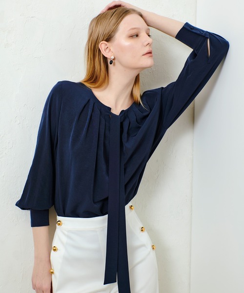 【allureville 2025 spring&summer】 ナチュラルな肌触りと、シルクの様な風合いを合わせ持ったボウブラウス。 ヴィンテージの様な雰囲気に加工した生地で仕立てているので、エレガンスでありながらカジュアルにも合わせやすいアイテムに。 フロントのボウを少し下の方で一からげすると、Vネックの衿開きになり、クールで女性らしい印象に。 きっちりとリボン結びをすると、 クラシックでエレガントな雰囲気が楽しめます。 デニムからキレイ目なスカートまで合わせやすいデザインで、様々なコーディネートを楽しめる一枚です。 【スタッフコメント】 シアー素材が上品なボウタイブラウス。 ボウデザインとギャザーを入れたネックデザインが、華やかでフェミニンな印象を与えます。 片結びで垂らすだけで縦ラインを強調、リボンに結んでも印象を変えて楽しめるアイテムです。 インしてもアウトしても着ていただける絶妙な丈感です。 ホワイトは少し透け感があります。 ご自宅でお手入れ可能です。 ※照明の関係により、実際よりも色味が違って見える場合がございます。 またパソコン・スマートフォンなどの環境により、製品と画像のカラーが異なる場合もございます。 予めご了承ください。