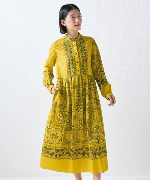 こんな花が咲きました。 人気のあるバンダナシリーズですが、今回は花や葉っぱをモチーフにしたイエローベースのオリジナル柄で作りました。 いつものようにタックで一部の柄を隠すようなデザインではなく、すっきりとシンプルなディテールで仕上げています。 黄色のベースに深い緑の葉と白い花がさわやかなボタニカル柄。 軽やかな春の雰囲気にぴったりのワンピースができました。 わきに挟み込んだひもは前で結んでも後ろで結んでもいい感じです。 MPサイズとは…Mサイズの幅で、背が低い人のための、袖丈や身丈などが短いサイズです。 身長146~154cmのMサイズの方におすすめです。 ※フェリシモの商品には、紐などでくくられている紙タグは付属しておりません。