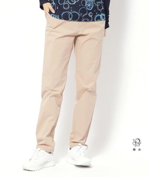 【デザイン】シンプルで洗練されたデザインが魅力のストレートパンツです。どんなスタイルにも合わせやすい定番カラーで、カジュアルからフォーマルまで幅広いコーディネートに対応可能。右後ろポケットにはラメ糸で施したロゴデザインがさりげなくきらびやかさをプラスし、控えめながらも個性が光るアクセントとなっています。ウエスト後ろ部分にはゴム仕様を取り入れ、快適な穿き心地と動きやすさを両立した一着です。【素材】多少の雨なら対応するように撥水加工付きです。複合繊維(ポリエステル)100%の軽量で滑らかな素材を採用。適度なハリ感と柔らかな質感を持ち、清潔感あるシルエットをキープします。シンプルだけど上品、そして機能的なこのパンツは、デイリーから特別なシーンまで幅広く活躍できるアイテムです。【仕様】・ポケット数:横×2 後ろ×2・前ファスナー・ウエスト後ろゴム・裏地なし※ライトベージュ(051)はやや透け感があります。※この商品はサンプルを使用して撮影しております。デザインや配色などが実際の商品とは一部異なる場合がございますのでご了承ください。※ウエスト後ろのウエストゴム、切り替えが両サイドのベルトループ奥に変更します。※照明の関係により、実際よりも色味が違って見える場合があります。また、パソコン・スマートフォンなどの環境により、若干製品と画像のカラーが異なる場合もございます。モデル情報:身長160cm B72 W58 H84 着用サイズ:38(M)店舗へのお問い合わせ商品番号:119-62401●製品寸法:36(S):W69cm H90cm 股下75cm 前股上25cm 渡り幅28cm 裾幅16cm38(M):W73cm H94cm 股下75cm 前股上26cm 渡り幅30cm 裾幅17cm40(L):W77cm H98cm 股下75cm 前股上26cm 渡り幅31cm 裾幅18cm42(LL):W81cm H102cm 股下75cm 前股上26cm 渡り幅32cm 裾幅19cm備考: