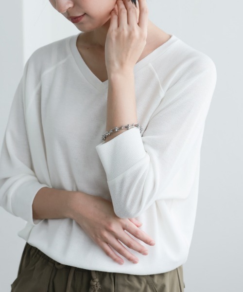 ■point・サマーニット・7分丈ドルマンスリーブ・リラックスシルエット■detailサラッとした滑らかな肌触りが特徴的なサマーニットが登場しました。着心地が良く、軽やかな風合いで、春から夏にかけて大活躍すること間違いなしの一枚です。ドルマンスリーブと7分丈が絶妙に組み合わさり、二の腕をカバーしながらも女性らしさを引き立ててくれるデザイン。リラックスした印象を与えつつ、ほどよいフィット感を感じさせるため、ゆったりとしたシルエットでもだらしなく見えません。また、ゆるVネックがデコルテラインを美しく見せてくれ、全体的にフェミニンでありながらも、カジュアルな雰囲気を大切にしています。腰周りをカバーしてくれる幅広の裾リブが、リラックス感を増し、ふんわりとしたシルエットを作り出します。程よく緩いシルエットなので、動きやすさも抜群です。カラーバリエーションはベーシックカラーを含む全8色。どんなシーンにも合わせやすく、コーディネートに取り入れやすいカラー展開で、気分や季節に合わせた選択が可能です。シンプルでありながらも女性らしさをしっかりと引き立ててくれる、まさに「一枚で決まる」アイテムです。■fabricサラッとした滑らかな肌触りのサマーニット素材は、軽やかで通気性が良く、涼しげな印象を与えます。肌に優しく、暑い季節でも快適に着用できるため、これからの季節にぴったり。伸縮性もあり、動きやすさも兼ね備えています。……………………透け感:ニット特有の透け感あり厚さ:薄手伸縮性:あり裏地:なしポケット:なし洗濯方法:手洗い推奨……………………※詳しいお手入れ方法は商品タグをご参照ください。■coordinateこのサマーニットは、カジュアルにもフェミニンにも着こなせる万能アイテムです。デニムやチノパンと合わせれば、リラックスしたカジュアルコーデが完成します。ワイドパンツやスカートと合わせれば、少しフェミニンでエレガントな印象にも。ゆるVネックとドルマンスリーブのデザインが、シンプルながらも女性らしさを引き立ててくれます。春から夏にかけて、気温の変化に対応できるサマーニットなので、レイヤードスタイルにも重宝します。薄手で軽いので、ジャケットやカーディガンを羽織ることで、肌寒い日でも着こなしやすく、季節の変わり目にも便利です。シンプルなデザインのため、アクセサリーや小物でアレンジしやすいのも嬉しいポイント。リラックス感がありながらも、程よいフィット感を持つため、どんな体型の方でも自信を持って着られるアイテムです。【M】着丈:63cm裄丈:61.5cm襟ぐり幅:22cm襟ぐり高さ:9cm袖口:7.5cm裾幅:35cm【L】着丈:65cm裄丈:63cm襟ぐり幅:22cm襟ぐり高さ:9cm袖口:9cm裾幅:36cm【LL】着丈:69cm裄丈:65cm襟ぐり幅:20.5cm襟ぐり高さ:12cm袖口:12.5cm裾幅:42cm