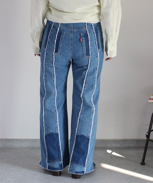 リメイク風に仕上げたヴィンテージ感たっぷりのCEPOオリジナルデニム♪ バックスタイルを美しく見せるフレアラインシルエット! 同素材・カラーのフリンジベストやデニムシャツでセットアップコーデも◎。 ◇Point◇ 足に沿ったキレイなフレアラインシルエット&バックのリメイクデザインが魅力のデニムパンツ。 デニムをもう1本逆さまに張り合わせたような独特なデザインで、立体感を表現しています。 裾はカットオフ仕様、さらにスリットを施すことでパンプス・ヒール・スニーカー様々なシューズにも対応。 生地もユーズド加工を施すなどヴィンテージ感に溢れた1本です。 ウエストは比翼を省いたジッパー仕様ですっきりしたデザインに。 同素材のフリンジベスト、ジャンスカ、リメイクデニムシャツ、バレルパンツも展開中です。 フリンジベストやデニムシャツで合わせればこなれたセットアップコーデに♪ ・リメイクデニムシャツ(CCB-0394) ・デニムフリンジベスト(CCB-0407) ・デニムバレルパンツ(CCB-0405) ・2wayデニムジャンスカ(CCB-0440) ◇Material◇ コットン100%の素材。表面に張りがありながらも履き込むことで柔らかくなっていきます。 厚すぎず薄すぎずの生地なのでオールシーズンで着用可能。 フロントジッパー仕様。YKKファスナーを使用しており、ロックが掛かるので、着用時にジッパーが開いてしまうのを防ぎます。 サイドポケットあり。 ◇Coordinate◇ 1本でコーデが決まるデザイン性の高いデニムパンツ。 トップスはシンプルなカットソーでも決まります♪ タックインでキレイなバックスタイルを見せるのもおすすめです! ※照明や天候により実際の色味と異なって見える場合がございます。ご了承くださいませ。 【キーワード】 #Y2K#20代#30代#40代#50代#旅行#ストリート#古着風#リメイク
