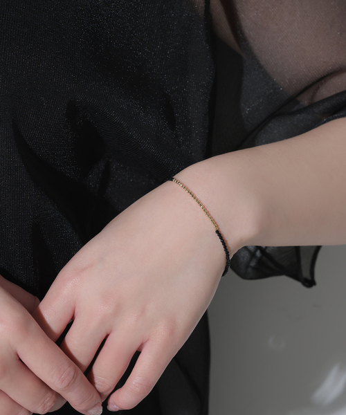 ミラーカットを施したオニキスが印象的なブレスレット。 2mmのオニキスビーズを繋げ、中央に2mmのゴールドビーズを配置しアクセントにしました。 光に当たるたびにビーズが繊細に輝き、手元を華やかに仕上げてくれます。 ※ステンレスワイヤーで繋いでいます。 強い負荷がかかるとワイヤー切れの原因になりますのでご注意ください。 <価格改定のお知らせ> 2025年3月3日より地金相場高騰のため、価格改定をさせて頂きます。 ご了承下さいますよう、お願い申し上げます。 -Lilasのアイテムをご愛用いただくにあたって- ・ジュエリーは繊細です。衝撃や摩擦・引っかかりにはお気をつけください。 ・スポーツや入浴・炊事・就寝時には着用をお避けください。 ・極端に高温な場所や寒冷地では火傷や凍傷の原因になる恐れがありますので着用を避けてください。 ・ご使用中かゆみやかぶれを感じた際は着用を中止し、専門医にご相談ください。 ・化粧品・洗剤・温泉・海水・薬剤等で色落ちや変質・変色することがあります。 ※照明の関係により、実際よりも色味が違って見える場合があります。 またパソコン・スマートフォンなどの環境により、若干製品と画像のカラーが異なる場合もございます。 ※商品の色味は、商品アップ画像をご参照ください。 ※商品包装は店舗と異なりビニールによる包装です。箱や保証書・説明書の付属はございません。予めご了承下さい。 ※デザインや計量器の精度により、サイズ表記と若干の差が生じる場合がございます。ご了承ください。