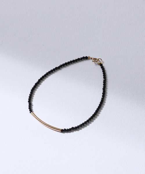 ミラーカットを施したオニキスが印象的なブレスレット。 2mmのオニキスビーズを繋げ、中央にゴールドのパイプを配置しアクセントにしました。 ビーズが繊細な輝きを放ち、パイプがシャープな雰囲気を演出します。 ※ステンレスワイヤーで繋いでいます。強い負荷がかかるとワイヤー切れの原因になりますのでご注意ください。 <価格改定のお知らせ> 2025年3月3日より地金相場高騰のため、価格改定をさせて頂きます。 ご了承下さいますよう、お願い申し上げます。 -Lilasのアイテムをご愛用いただくにあたって- ・ジュエリーは繊細です。衝撃や摩擦・引っかかりにはお気をつけください。 ・スポーツや入浴・炊事・就寝時には着用をお避けください。 ・極端に高温な場所や寒冷地では火傷や凍傷の原因になる恐れがありますので着用を避けてください。 ・ご使用中かゆみやかぶれを感じた際は着用を中止し、専門医にご相談ください。 ・化粧品・洗剤・温泉・海水・薬剤等で色落ちや変質・変色することがあります。 ※照明の関係により、実際よりも色味が違って見える場合があります。 またパソコン・スマートフォンなどの環境により、若干製品と画像のカラーが異なる場合もございます。 ※商品の色味は、商品アップ画像をご参照ください。 ※商品包装は店舗と異なりビニールによる包装です。箱や保証書・説明書の付属はございません。予めご了承下さい。 ※デザインや計量器の精度により、サイズ表記と若干の差が生じる場合がございます。ご了承ください。