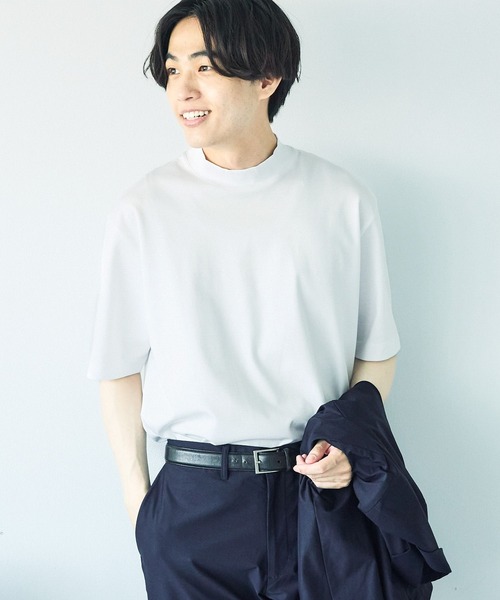 ジャケットのインナーに最適なきれい目Tシャツ 【素材/機能】 サスティナビリティに配慮したUSAコットンを100%使用しながら、 美しい光沢感とシルクのようなしなやかさを叶えた肌触り抜群のポンチ素材。 【デザイン】 ジャケットインナーとして着用した際に、 ジャケットの襟回りが汚れない様に設計されたモックネックデザイン。 ONシーンにもOFFシーンにも使いやすい襟の高さで、一枚で着用してもサマ見えします。 【お勧めスタイリング】 アーバンスラックスなどのきれい目なボトムスやジャケット合わせはもちろん、 カジュアルなコーディネートを引き立てる1枚としてもおすすめで合わせるアイテムを選びません。 程よい光沢感はテレワークの画面映えにもぴったり。 ----------------------------- 裏地:なし 透け感:やや透ける 伸縮性:あり 生地感・厚さ:普通 ----------------------------- ※ホワイトで計測しています。 ※こちらは参考情報となります。カラーにより多少の誤差がございます。 【お買い物が便利になる機能がたくさん!】 ▼商品のお気に入り登録▼ 完売アイテムの再入荷通知、ラスト1点、またクーポンやお値下げ通知をお知らせします。 ▼ブランドのお気に入り登録▼ 新商品や再入荷のお知らせ等、いち早くブランドのお得な情報を受け取ることができます。 ぜひご登録ください。